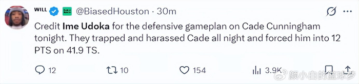 休媒:今晚对坎宁安的防守策略要归功于乌度卡,球队整晚都在对CC进行包夹、紧逼防守,这让他只拿到12分,命中率仅41.9%。