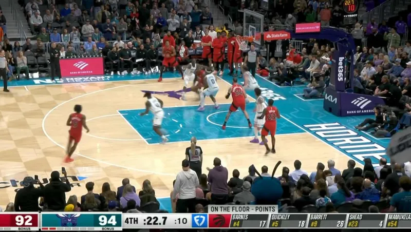 比赛最后23.3秒,裁判漏吹了RJ-巴雷特的走步违例,巴雷特将左脚作为中轴脚,但在合球后移动该脚。
